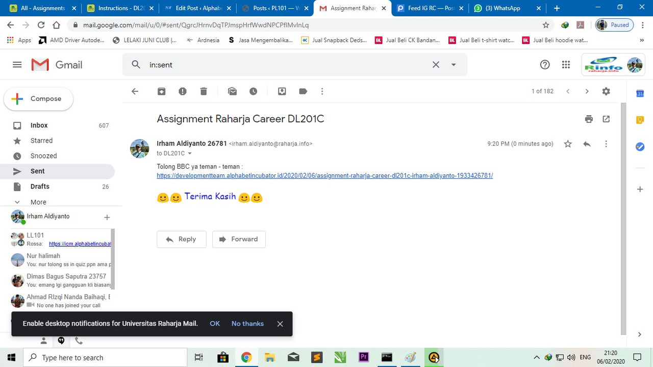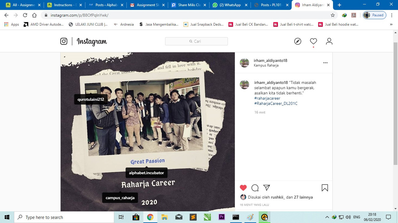 - Update feed ke Instagram masing-masing dengan tag mamoi (@qurotulaini212), Kampus (@campus_raharja) dan Alphabet Incubator @alphabet.incubator) dan dengan hashtag #RaharjaCareer_DL201C #RaharjaCareer serta caption harus menarik ya