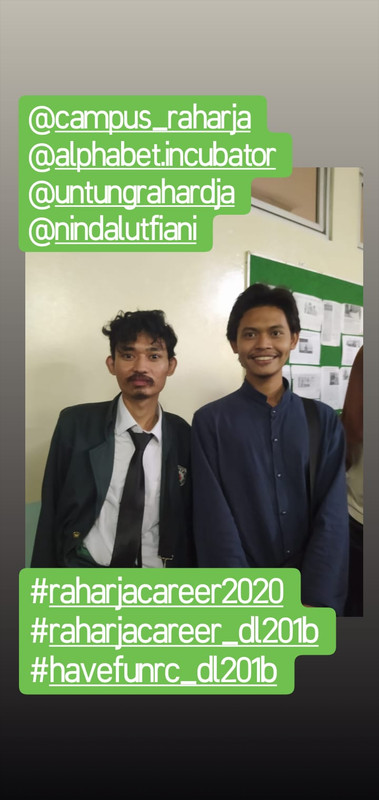 - Lampirkan pembuktian bahwa anda telah mengikuti acara tersebut dan post foto bersama peserta Raharja Career yang di upload ke Instagram kalian dengan hastag #RaharjaCareer2020 #RaharjaCareer_DL201B #HaveFunRC_DL201B dan tag ke @campus_raharja @alphabet.incubator @untungrahardja @nindalutfiani.