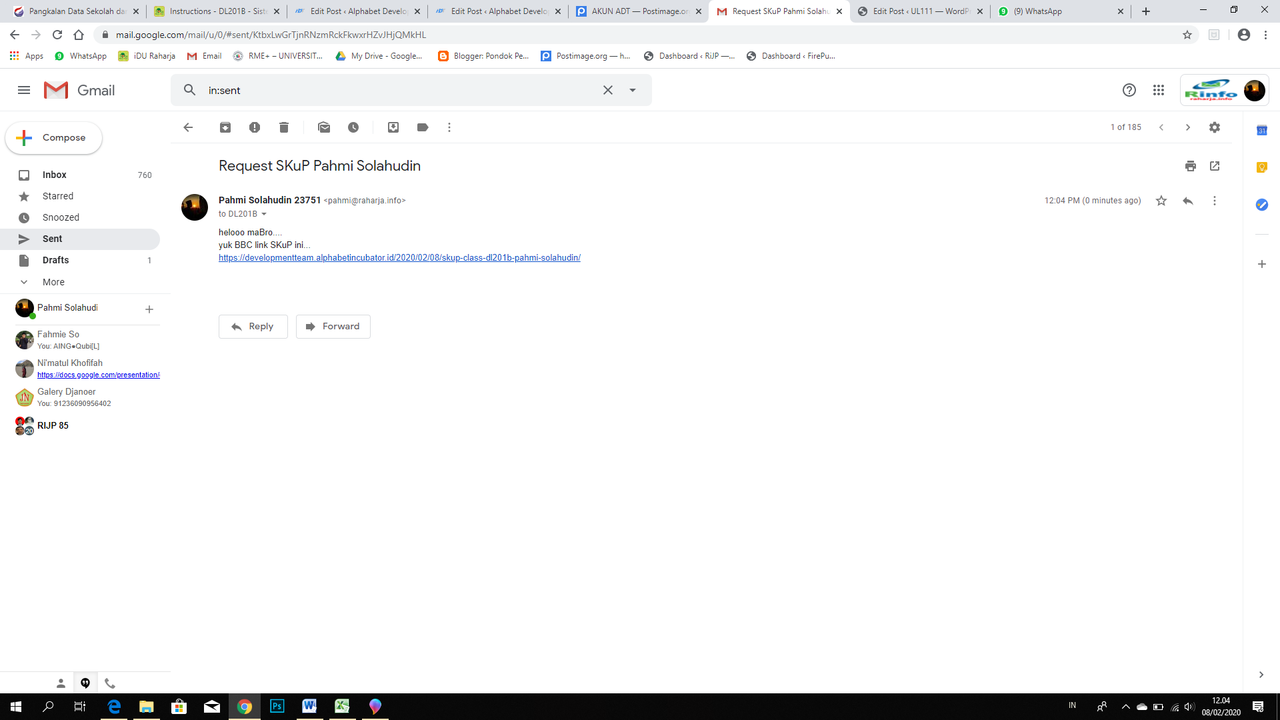 - Pastikan SKuP kalian ter-link DISINI, Maka segera lakukan proses request dengan cara mengirimkan email ke dalam milis [email protected] dengan subjek email “Request Update Link SKuP Class DL201B”.Misalnya, jika belum ada yang kirim SKuP bisa dimulai oleh satu orang buat subject pada milis yaitu “Request Update Link SKuP Class DL201B” namun jika dari Class DL201B sudah ada yang mengirim SKuP di milis, yang lain bisa balas dengan Reply All. Tidak membuat subjek yang baru.
