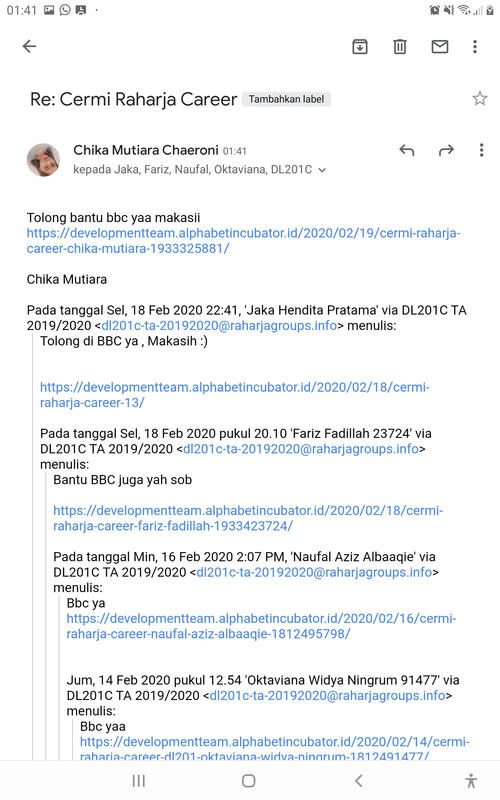 - Buat Cermi (Cerita Keseruan) Raharja Career yang telah selesai dibuat harus dikirim ke milis class yaitu [email protected]