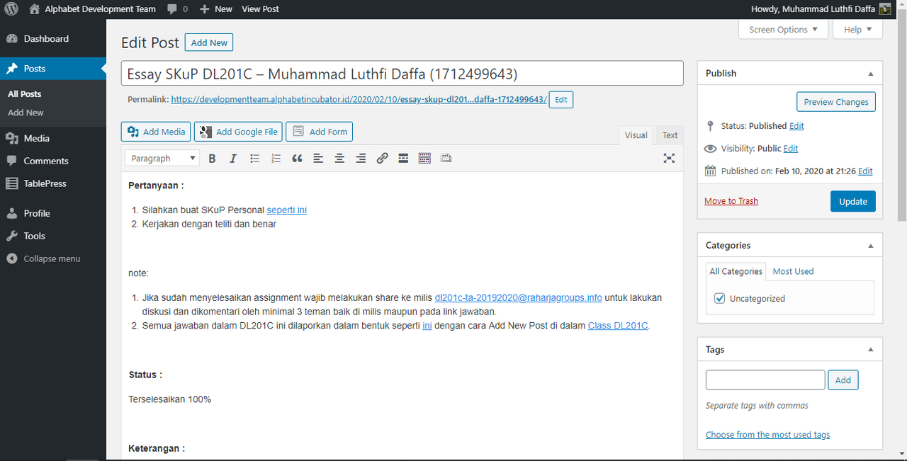- Semua jawaban dalam DL201C ini dilaporkan dalam bentuk seperti ini dengan cara Add New Post di dalam Class DL201C.