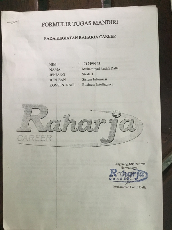 - Form tugas Raharja Career ditandatangani oleh peserta Raharja Career dan distempel panitia Raharja Career.