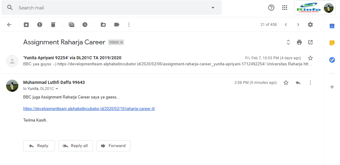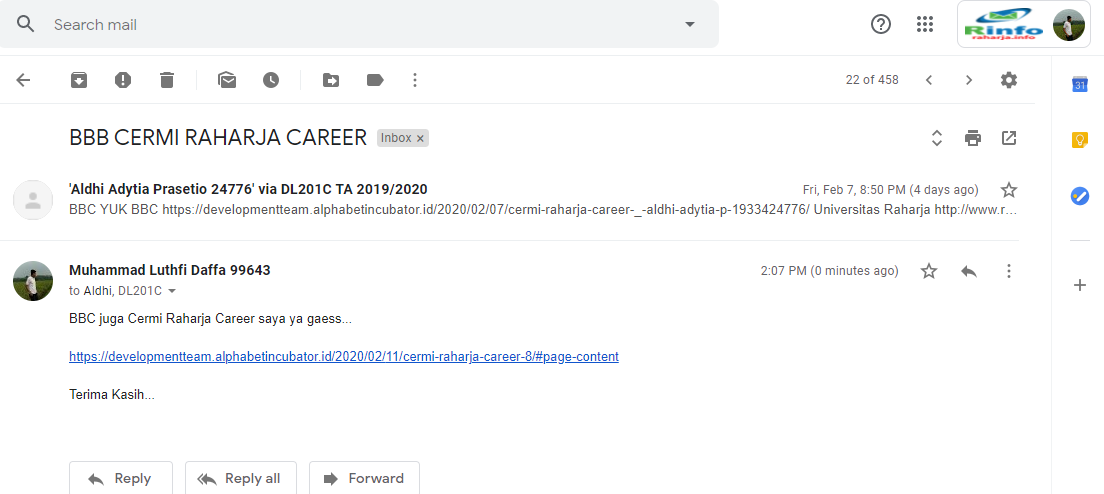 - Buat Cermi (Cerita Keseruan) Raharja Career yang telah selesai dibuat harus dikirim ke milis class yaitu [email protected]