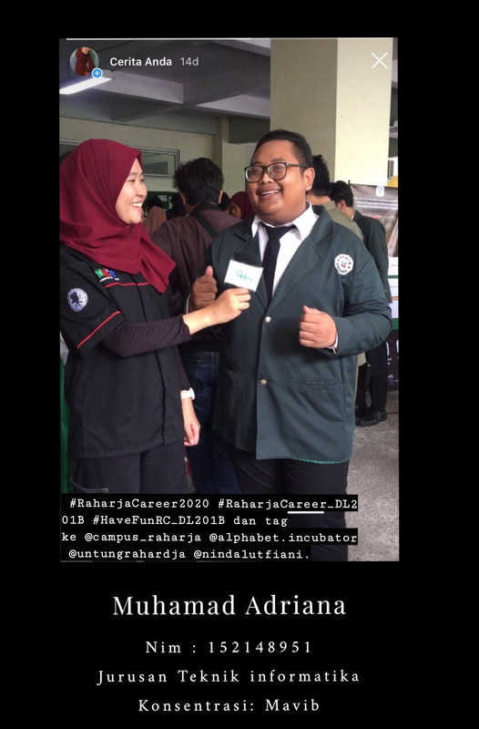- Lampirkan pembuktian bahwa anda telah mengikuti acara tersebut dan post foto bersama peserta Raharja Career yang di upload ke Instagram kalian dengan hastag #RaharjaCareer2020 #RaharjaCareer_DL201B #HaveFunRC_DL201B dan tag ke @campus_raharja @alphabet.incubator @untungrahardja @nindalutfiani.