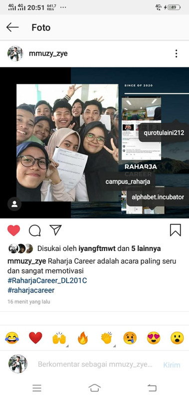 - Update feed ke Instagram masing-masing dengan tag mamoi (@qurotulaini212), Kampus (@campus_raharja) dan Alphabet Incubator @alphabet.incubator) dan dengan hashtag #RaharjaCareer_DL201C #RaharjaCareer serta caption harus menarik ya