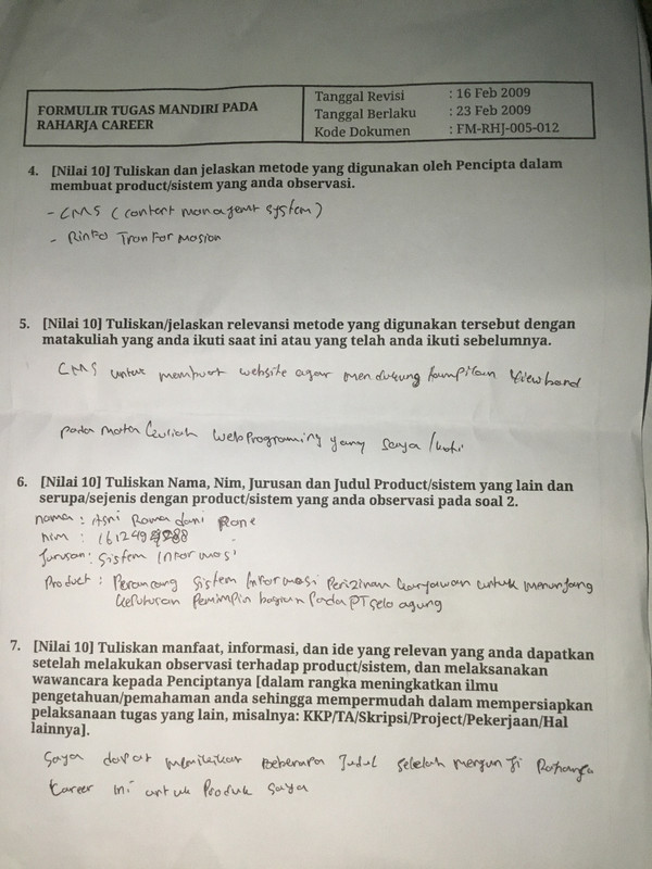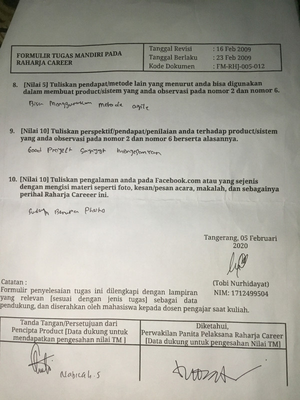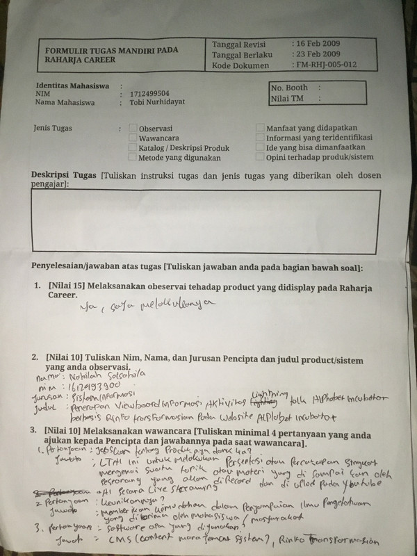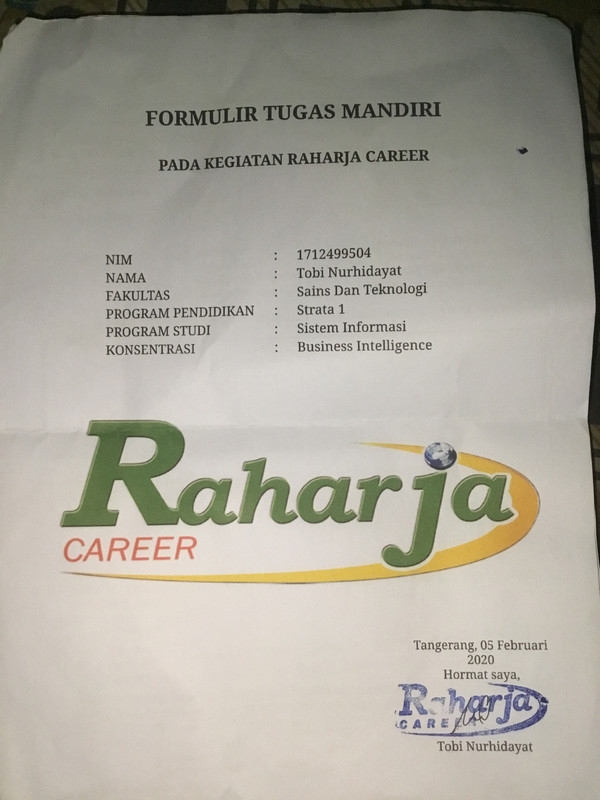 4. Form tugas Raharja Career di tanda tangani oleh peserta Raharja Career dan di stempel oleh Panitia Raharja Career.