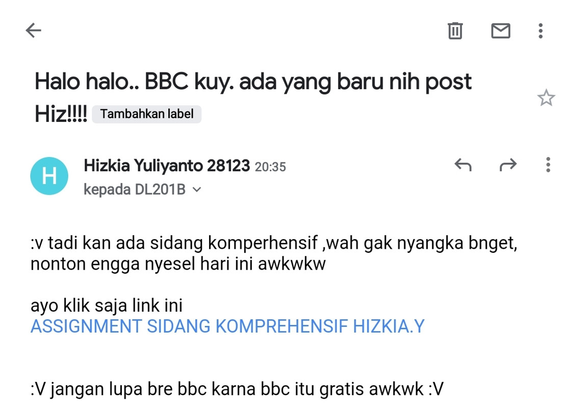 4. Jika sudah menyelesaikan assignment wajib melakukan share ke milis [email protected] untuk lakukan diskusi dan di BBC oleh minimal 12 teman baik di ADT.