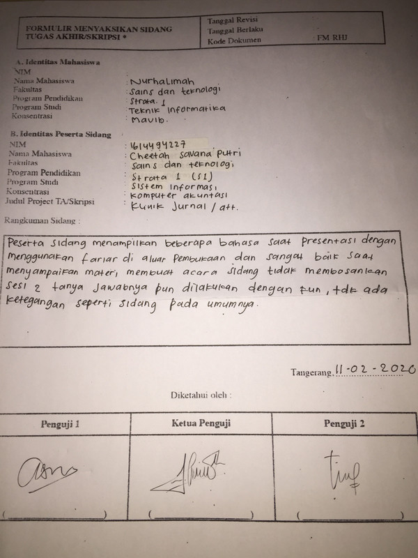 - Tulis minimal 3 (tiga) pertanyaan sidang yang diajukan penguji kepada peserta sidang.