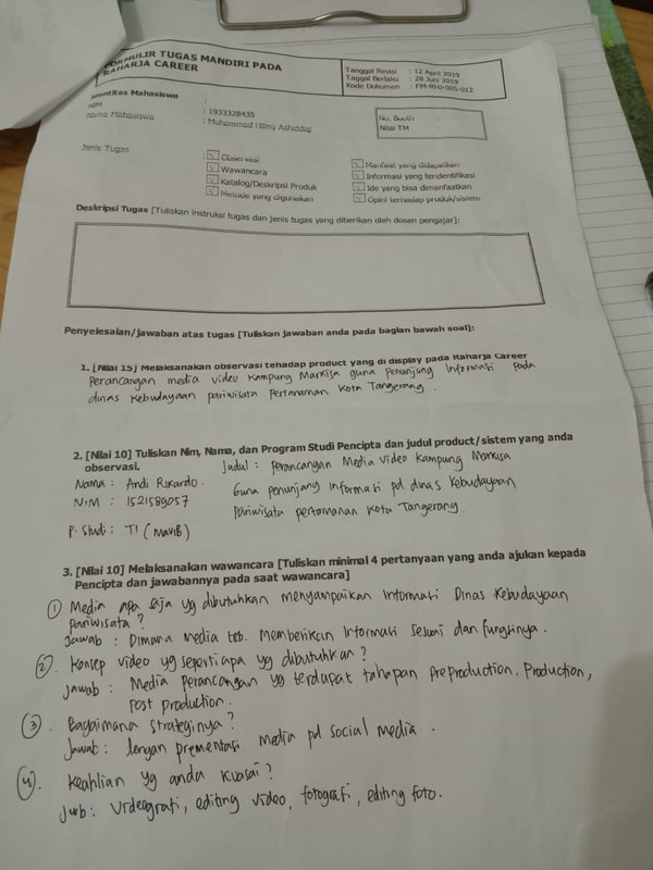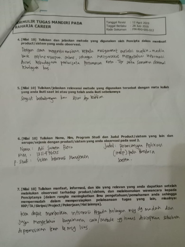 - Form tugas Raharja Career di tanda tangani oleh peserta Raharja Career dan di stempel oleh Panitia Raharja Career.