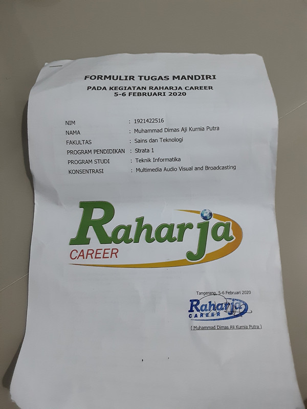 2. Form tugas Raharja Career ditandatangani oleh peserta Raharja Career dan distempel panitia Raharja Career.