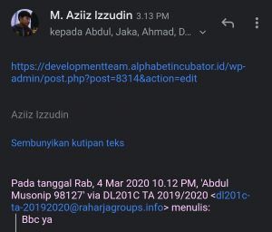 5. Langkah terbaru berikut ini semua temuan ke dalam http: / /developmentteam.alphabetincubator.id/ dengan cara Tambahkan Posting Baru di dalam https://developmentteam.alphabetincubator.id/ yang kemudian juga dikirim ke milis [email protected] untuk diskusi dan dikomentari dengan minimal 3 komentar baik pada tautan jawaban.