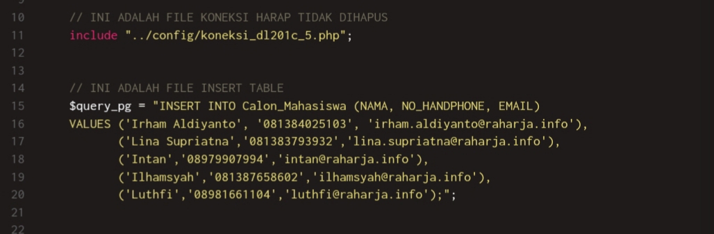 3. Memasukkan data calon mahasiswa kedalam database menggunakan Insert into
