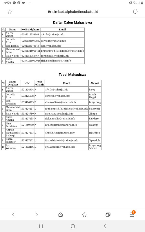 Hari berikutnya sang klien ingin menambah 1 tabel lagi yaitu tabel mahasiswa, kolom pada tabel tersebut bisa kalian tentukan sendiri beserta tipe datanya, minimal kalian harus membuat 5 kolom (sebagai contoh nama_lengkap VARCHAR (50), tanggal_lahir DATE, jenis_kelamin VARCHAR(20)). Setelah itu masukkan 10 data untuk mengisi tabel mahasiswa. Untuk mendapatkan nilai tambahan, kalian harus berusaha untuk menampilkan tabel beserta isi data ke dalam website.
