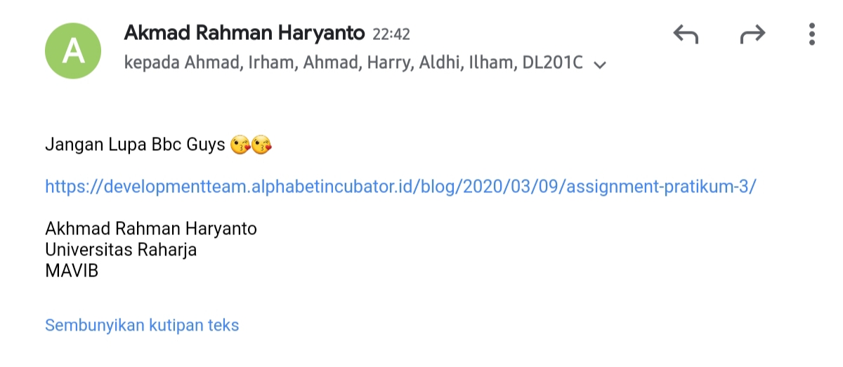 5 . Langkah terakhir yaitu semua jawaban ke dalam https://developmentteam.alphabetincubator.id/ dengan cara Add New Post di dalam https://developmentteam.alphabetincubator.id/ yang kemudian juga dikirim ke milis [email protected] untuk lakukan diskusi dan dikomentari oleh minimal 3 comment baik di milis maupun pada link jawaban.