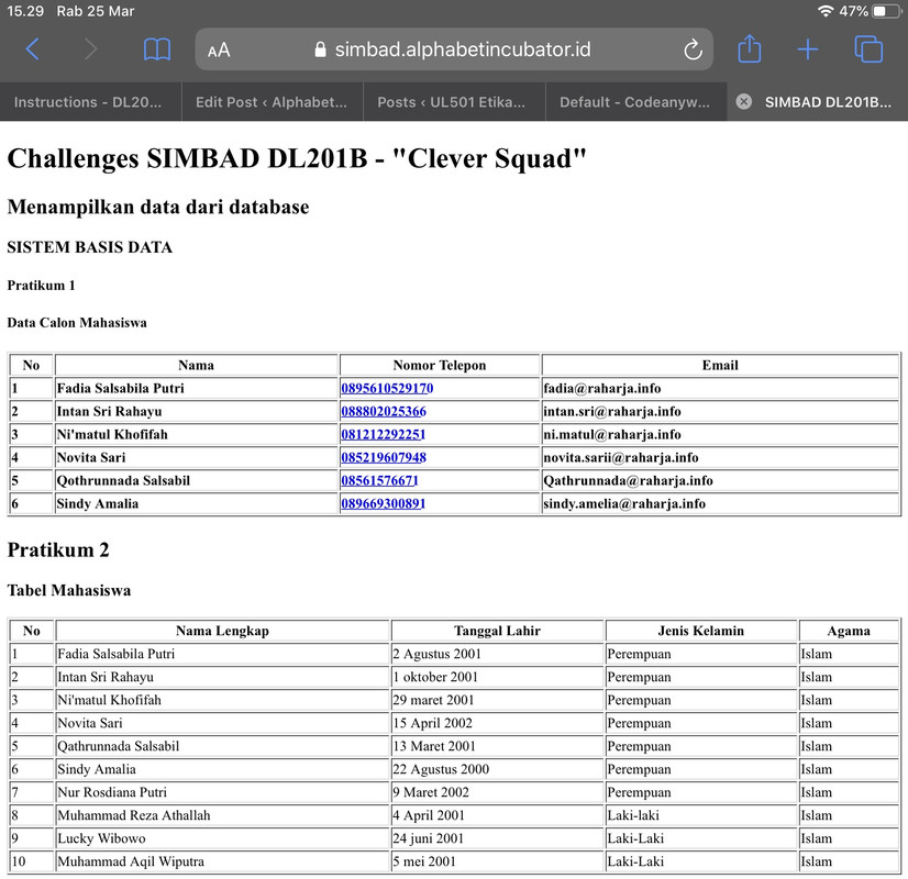 Hari berikutnya sang klien ingin menambah 1 tabel lagi yaitu tabel mahasiswa, kolom pada tabel tersebut bisa kalian tentukan sendiri beserta tipe datanya, minimal kalian harus membuat 5 kolom (sebagai contoh nama_lengkap VARCHAR (50), tanggal_lahir DATE, jenis_kelamin VARCHAR(20)). Setelah itu masukkan 10 data untuk mengisi tabel mahasiswa. Untuk mendapatkan nilai tambahan, kalian harus berusaha untuk menampilkan tabel beserta isi data ke dalam website.