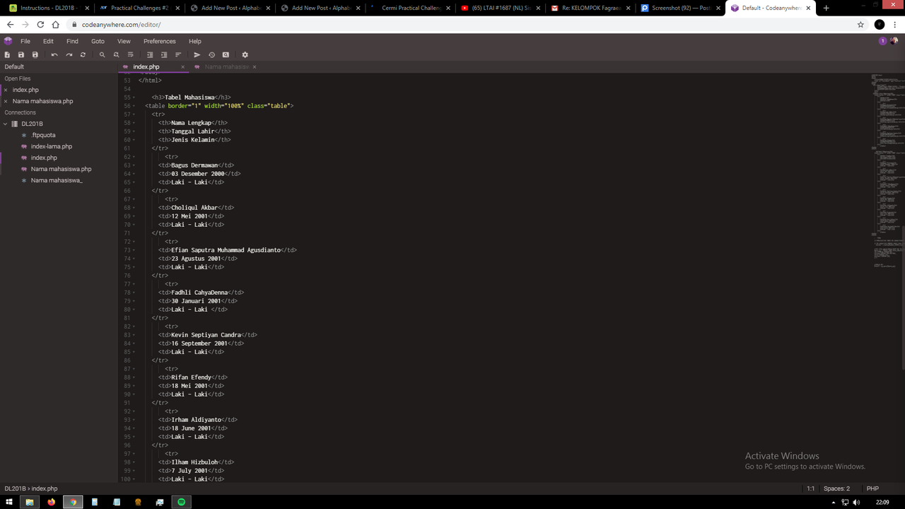 Hari berikutnya sang klien ingin menambah 1 tabel lagi yaitu tabel mahasiswa, kolom pada tabel tersebut bisa kalian tentukan sendiri beserta tipe datanya, minimal kalian harus membuat 5 kolom (sebagai contoh nama_lengkap VARCHAR (50), tanggal_lahir DATE, jenis_kelamin VARCHAR(20)). Setelah itu masukkan 10 data untuk mengisi tabel mahasiswa. Untuk mendapatkan nilai tambahan, kalian harus berusaha untuk menampilkan tabel beserta isi data ke dalam website.