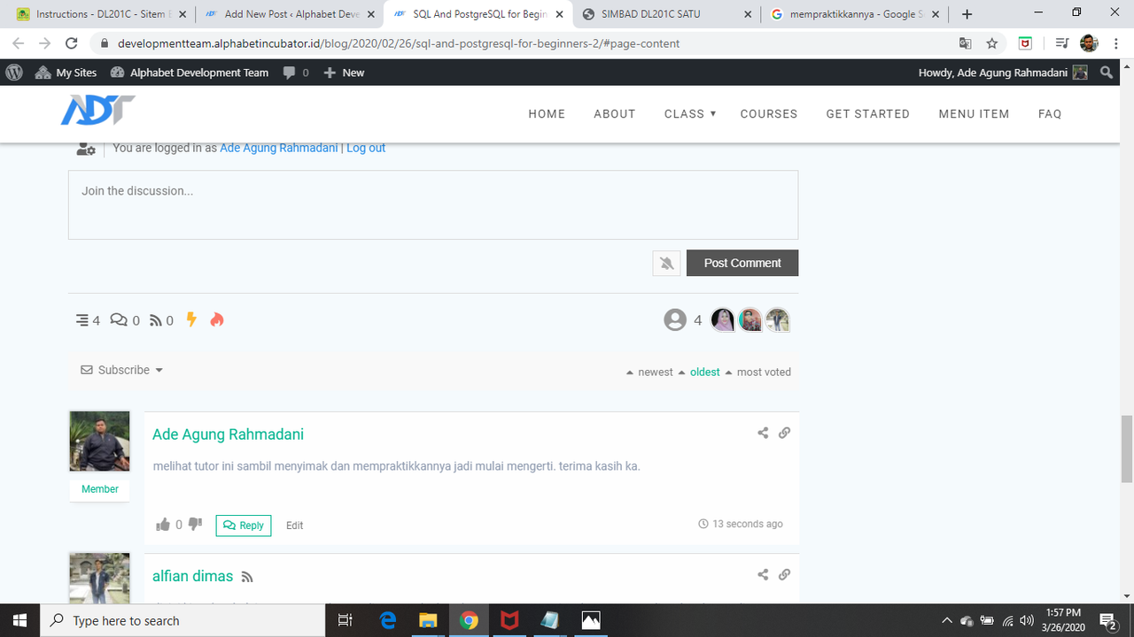 5. Langkah terakhir yaitu semua jawaban ke dalam https://developmentteam.alphabetincubator.id/ dengan cara Add New Post di dalam https://developmentteam.alphabetincubator.id/ yang kemudian juga dikirim ke milis  [email protected] untuk lakukan diskusi dan dikomentari oleh minimal 3 comment baik di milis maupun pada link jawaban.