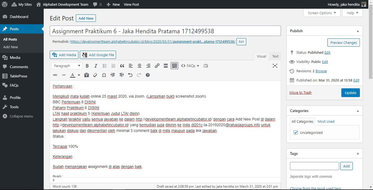 Langkah terakhir yaitu semua jawaban ke dalam https://developmentteam.alphabetincubator.id/ dengan cara Add New Post di dalam https://developmentteam.alphabetincubator.id/ yang kemudian juga dikirim ke milis [email protected] untuk lakukan diskusi dan dikomentari oleh minimal 3 comment baik di milis maupun pada link jawaban.