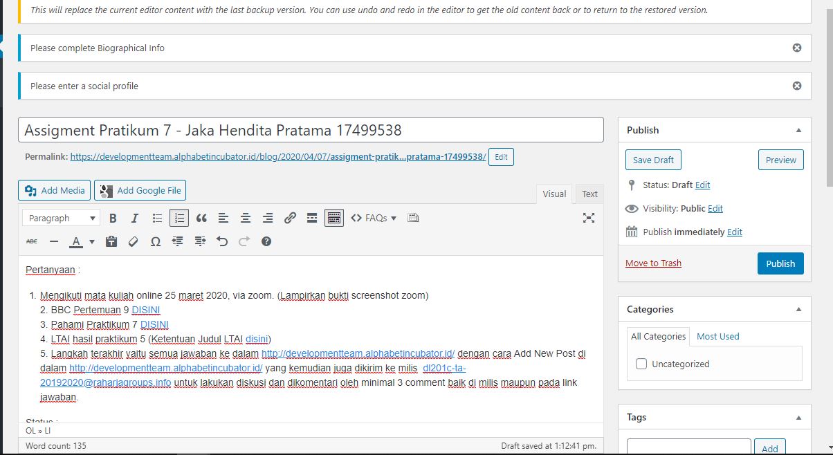 5. Langkah terakhir yaitu semua jawaban ke dalam https://developmentteam.alphabetincubator.id/ dengan cara Add New Post di dalam https://developmentteam.alphabetincubator.id/ yang kemudian juga dikirim ke milis [email protected] untuk lakukan diskusi dan dikomentari oleh minimal 3 comment baik di milis maupun pada link jawaban.