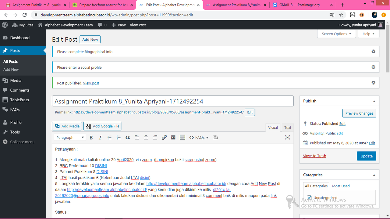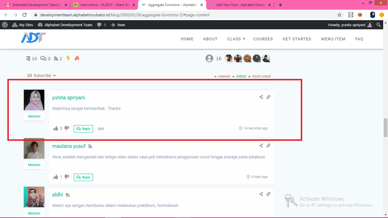 5. Langkah terakhir yaitu semua jawaban ke dalam https://developmentteam.alphabetincubator.id/ dengan cara Add New Post di dalam https://developmentteam.alphabetincubator.id/ yang kemudian juga dikirim ke milis [email protected] untuk lakukan diskusi dan dikomentari oleh minimal 3 comment baik di milis maupun pada link jawaban.