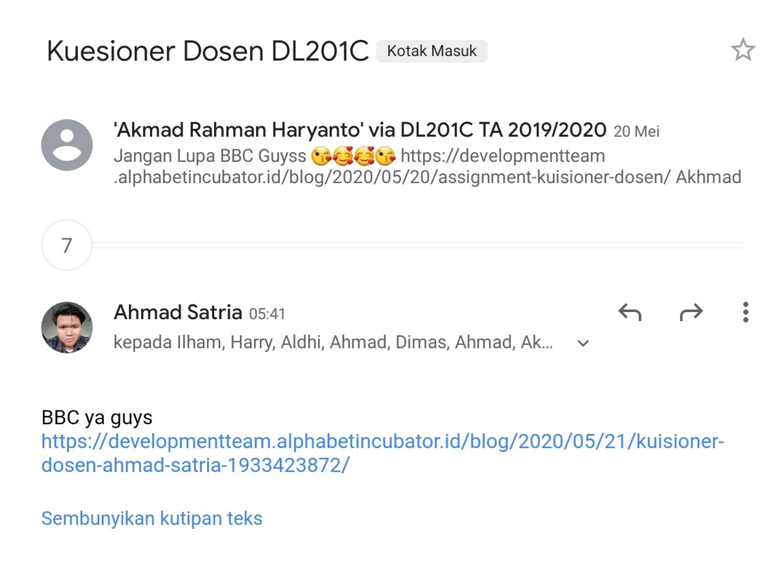 - Jika sudah menyelesaikan assignment wajib melakukan share ke milis [email protected] , dianjurkan satu subjek dalam satu kelas dan teman lainnya bisa “Reply All”. Misalnya, jika belum ada yang kirim bisa dimulai oleh satu orang buat subject pada milis yaitu “Kuesioner Dosen DL201C“, namun jika dari DL201C sudah ada yang mengirim, yang lain bisa balas dengan Reply All. Tidak membuat subjek yang baru