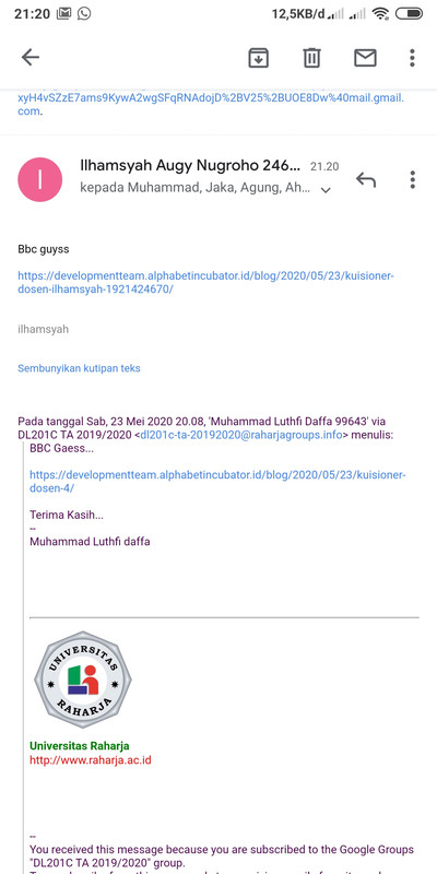 - Jika sudah menyelesaikan assignment wajib melakukan share ke milis [email protected] , dianjurkan satu subjek dalam satu kelas dan teman lainnya bisa “Reply All”. Misalnya, jika belum ada yang kirim bisa dimulai oleh satu orang buat subject pada milis yaitu “Kuesioner Dosen DL201C“, namun jika dari DL201C sudah ada yang mengirim, yang lain bisa balas dengan Reply All. Tidak membuat subjek yang baru