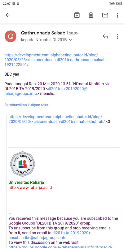 - Jika telah menyelesaikan tugas yang harus dilakukan, bagikan ke milis [email protected] , terima satu subjek dalam satu kelas dan satu lagi teman lain yang dapat digunakan “Balas Semua”. Misalnya, jika belum ada yang dapat dimulai oleh satu orang membuat subjek pada milis yaitu ” Kuesioner Dosen DL201B “, namun jika dari DL201B sudah ada yang mengirim, yang lain bisa balas dengan Balas Semua. Tidak membuat subjek yang baru