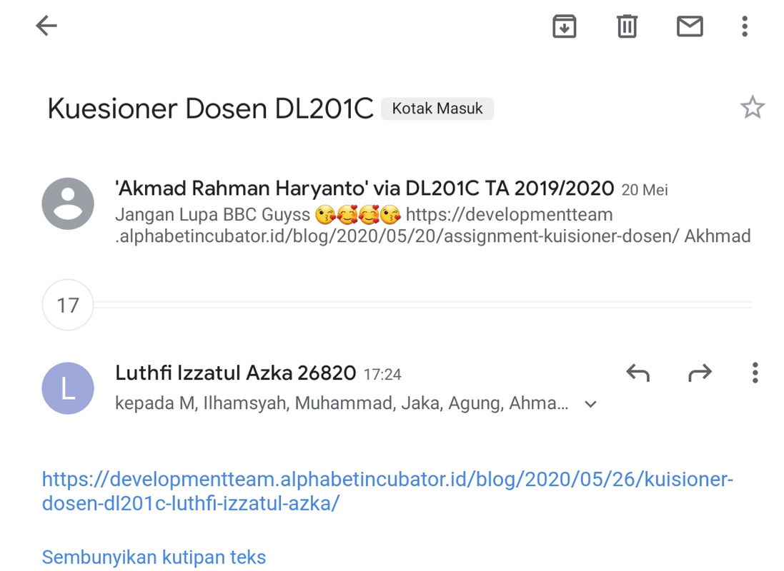 - Jika sudah menyelesaikan assignment wajib melakukan share ke milis [email protected] , dianjurkan satu subjek dalam satu kelas dan teman lainnya bisa “Reply All”. Misalnya, jika belum ada yang kirim bisa dimulai oleh satu orang buat subject pada milis yaitu “Kuesioner Dosen DL201C“, namun jika dari DL201C sudah ada yang mengirim, yang lain bisa balas dengan Reply All. Tidak membuat subjek yang baru