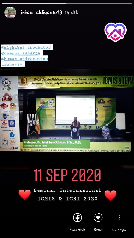 4. Melampirkan Screenshot hasil menonton Live Youtube Seminar Internasional ICMIS & ICRI 2020 yang di upload pada Feed atau IG Story dan Tag @alphabet.incubator @Campus_Raharja @humas_universitas_raharja