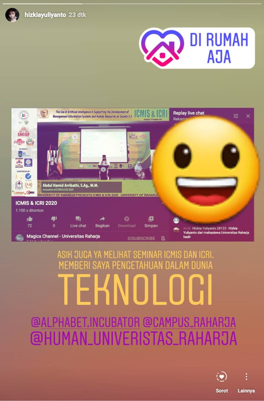4. Melampirkan Screenshot hasil menonton Live Youtube Seminar Internasional ICMIS & ICRI 2020 yang di upload pada Feed atau IG Story dan Tag @alphabet.incubator @Campus_Raharja @humas_universitas_raharja