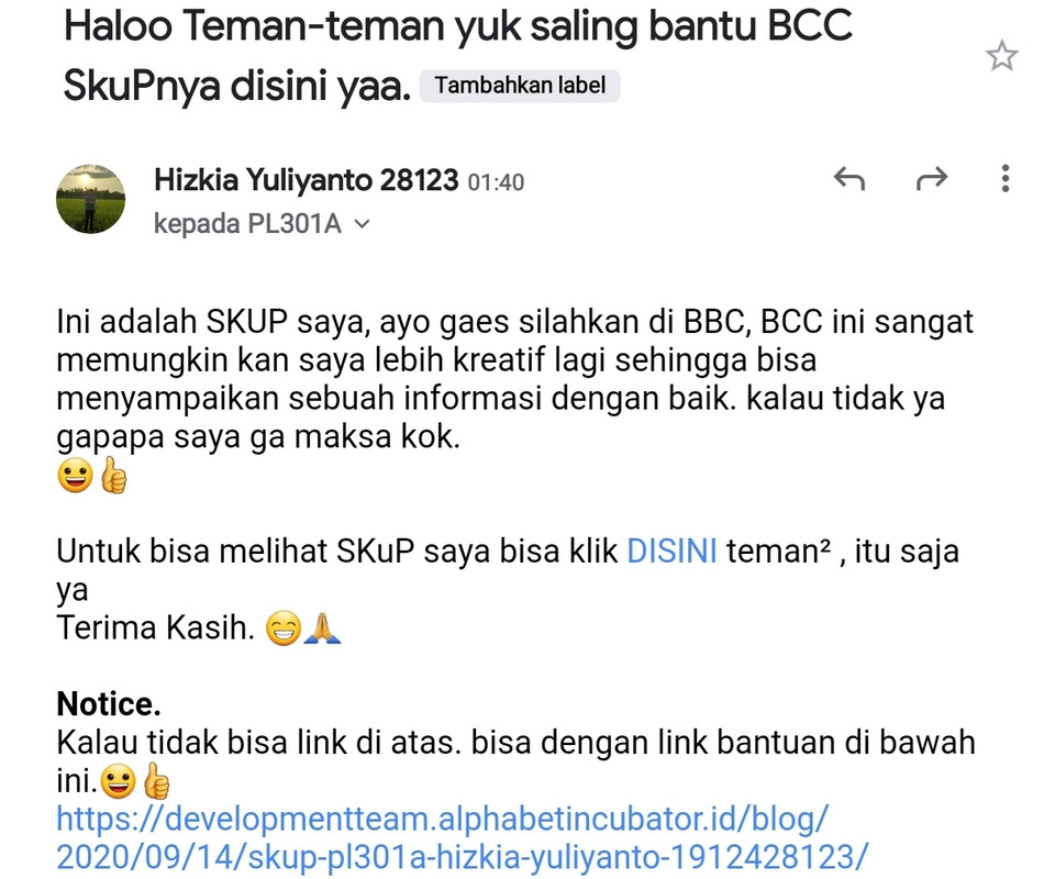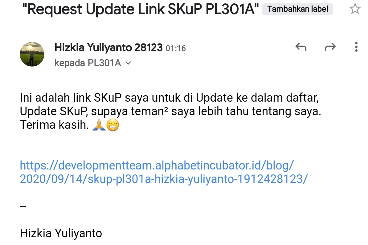 4. Pastikan SKuP kalian ter-link, Maka segera lakukan proses request dengan cara mengirimkan link ke dalam WAG  dengan subjek email “Request Update Link SKuP PL301A”.Misalnya, jika belum ada yang kirim SKuP bisa dimulai oleh satu orang buat subject pada milis PL301A  yaitu “Request Update Link SKuP PL301A”,  yang lain bisa balas dengan melanjutkan Copy lalu isiTidak membuat subjek yang baru.