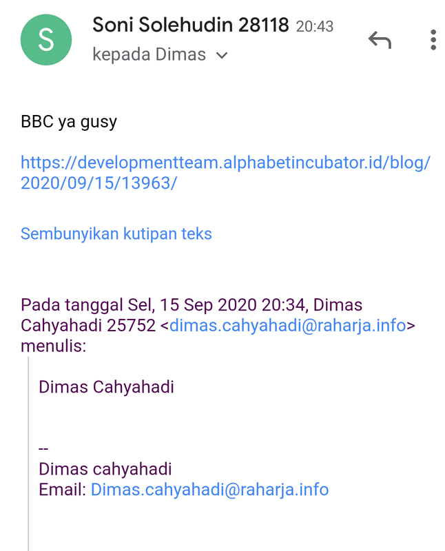 4. Pastikan SKuP kalian ter-link, Maka segera lakukan proses request dengan cara mengirimkan link ke dalam WAG  dengan subjek email “Request Update Link SKuP PL301A”.Misalnya, jika belum ada yang kirim SKuP bisa dimulai oleh satu orang buat subject pada milis PL301A  yaitu “Request Update Link SKuP PL301A”,  yang lain bisa balas dengan melanjutkan Copy lalu isiTidak membuat subjek yang baru.