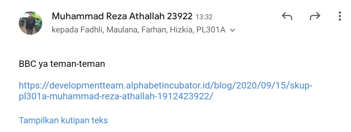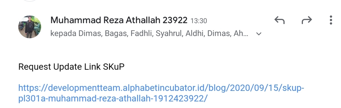 4. Pastikan SKuP kalian ter-link, Maka segera lakukan proses request dengan cara mengirimkan link ke dalam WAG  dengan subjek email “Request Update Link SKuP PL301A”.Misalnya, jika belum ada yang kirim SKuP bisa dimulai oleh satu orang buat subject pada milis PL301A  yaitu “Request Update Link SKuP PL301A”,  yang lain bisa balas dengan melanjutkan Copy lalu isiTidak membuat subjek yang baru.