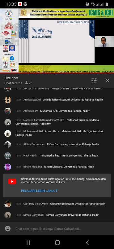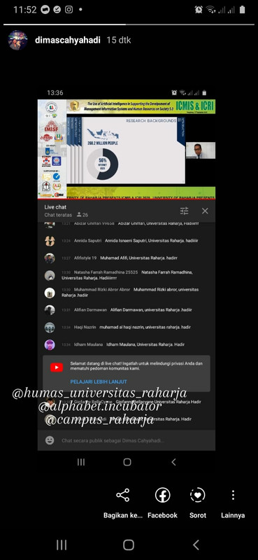 4. Melampirkan Screenshot hasil menonton Live Youtube Seminar Internasional ICMIS & ICRI 2020 yang di upload pada Feed atau IG Story dan Tag @alphabet.incubator @Campus_Raharja @humas_universitas_raharja