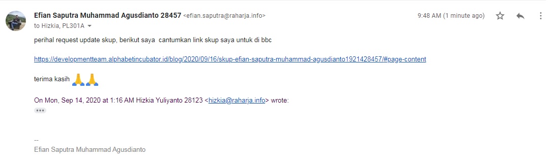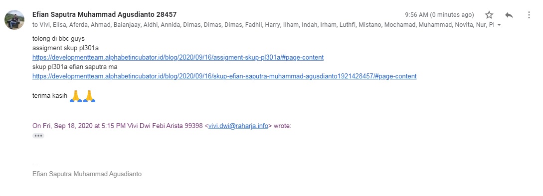 - Pastikan SKuP kalian ter-link, Maka segera lakukan proses request dengan cara mengirimkan link ke dalam WAG dengan subjek email “Request Update Link SKuP PL301A”.Misalnya, jika belum ada yang kirim SKuP bisa dimulai oleh satu orang buat subject pada milis PL301A yaitu “Request Update Link SKuP PL301A”, yang lain bisa balas dengan melanjutkan Copy lalu isi. Tidak membuat subjek yang baru.