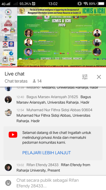4. Melampirkan Screenshot hasil menonton Live Youtube Seminar Internasional ICMIS & ICRI 2020 yang di upload pada Feed atau IG Story dan Tag @alphabet.incubator @Campus_Raharja @humas_universitas_raharja