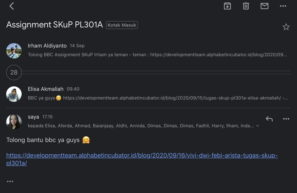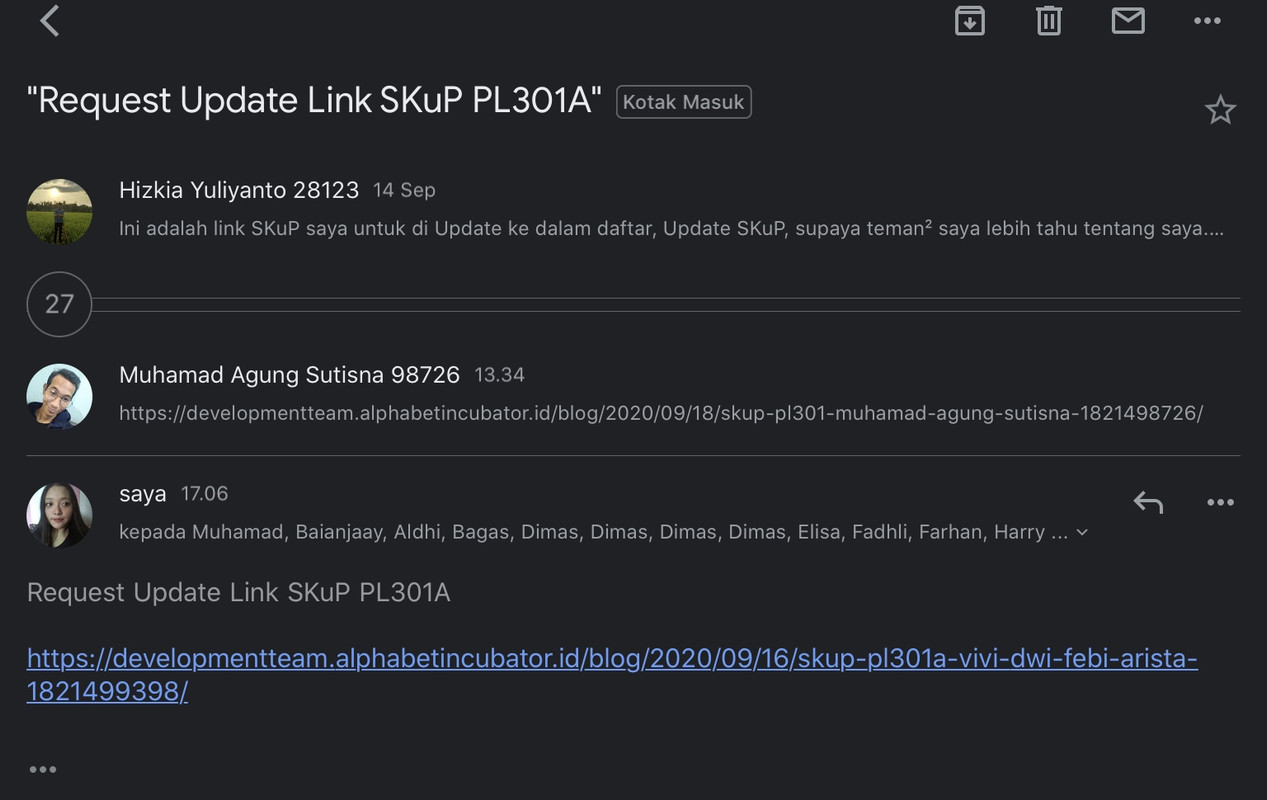 4. Pastikan SKuP kalian ter-link, Maka segera lakukan proses request dengan cara mengirimkan link ke dalam WAG dengan subjek email “Request Update Link SKuP PL301A”.Misalnya, jika belum ada yang kirim SKuP bisa dimulai oleh satu orang buat subject pada milis PL301A yaitu “Request Update Link SKuP PL301A”, yang lain bisa balas dengan melanjutkan Copy lalu isi. Tidak membuat subjek yang baru.