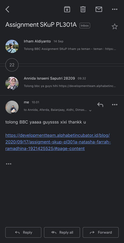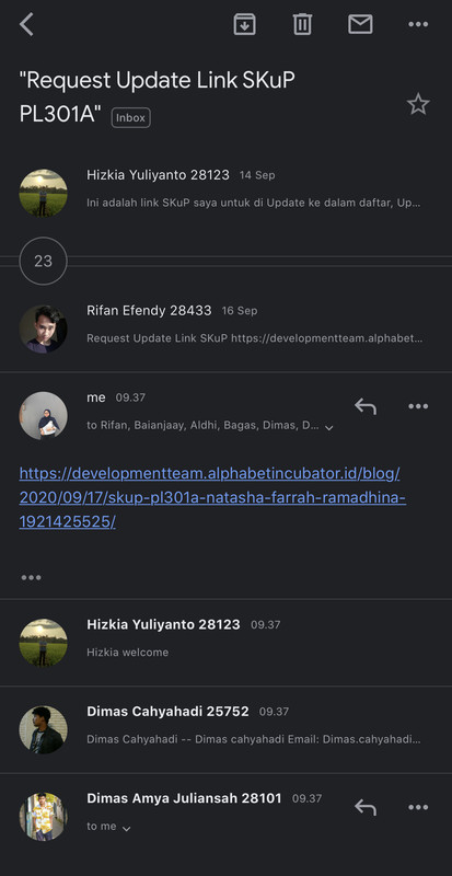 - Pastikan SKuP kalian ter-link, Maka segera lakukan proses request dengan cara mengirimkan link ke dalam WAG dengan subjek email “Request Update Link SKuP PL301A”.Misalnya, jika belum ada yang kirim SKuP bisa dimulai oleh satu orang buat subject pada milis PL301A yaitu “Request Update Link SKuP PL301A”, yang lain bisa balas dengan melanjutkan Copy lalu isi. Tidak membuat subjek yang baru.