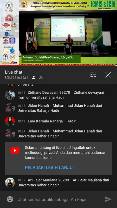4. Melampirkan Screenshot hasil menonton Live Youtube Seminar Internasional ICMIS & ICRI 2020 yang di upload pada Feed atau IG Story dan Tag @alphabet.incubator @Campus_Raharja @humas_universitas_raharja