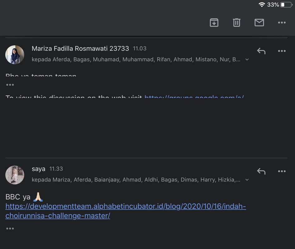 5. Langkah terakhir yaitu semua jawaban ke dalam https://developmentteam.alphabetincubator.id/ dengan cara Add New Post di dalam https://developmentteam.alphabetincubator.id/ yang kemudian juga dikirim ke milis & WAG [email protected] untuk lakukan diskusi dan dikomentari oleh minimal 10 BBC baik di milis maupun pada link jawaban. >> SUDAH