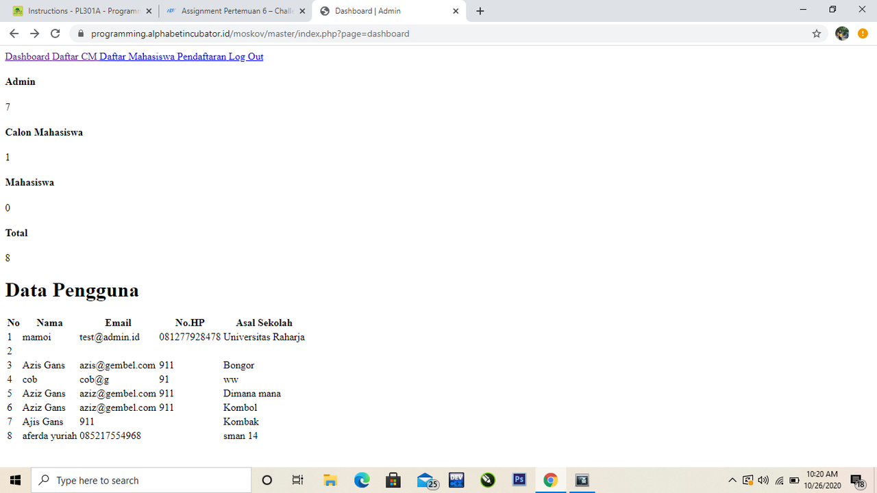 langsung aferda mulai saja pembahasannya, yang pertama yaitu kita copas aja di pertemuan 4 yaitu form login dan daftar serta semua prosesnya dikarenakan kita masih memakai login dan daftar nah setelah itu kita ganti ni di bagian process login yang pertama yaitu menampilkan total semua user caranya memakai perintah query select data seperti biasa nah untuk menampilkan calon mahasiswa dengan mahasiswa menggunakan perintah WHERE nah setelah itu kita tinggal bikin tabelnya, kita tinggal cari aja cara membuat tabel yang bagus di google yang akan kita pakai buat tabel data pengguna dan statistik pengguna. Untuk yang kedua yaitu menampilkan data pengguna yang dimana kita juga tinggal copas aja di bagian syntax select data yang dibagian calon mahasiswa / di mahasiswa untuk tabelnya juga tinggal copas saja dan untuk hasilnya seperti gambar dibawah ini, untuk punya kelompok aferda tabelnya masih sederhana :