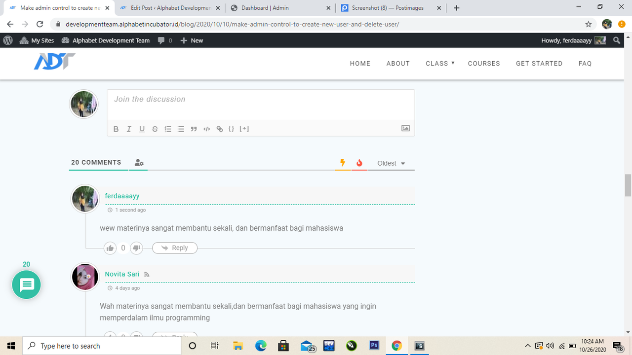 3. Buatlah hasil pemaham pertemuan 6 mengenai Make admin control to create new user & delete user yang dituangkan dalam cermi https://developmentteam.alphabetincubator.id/