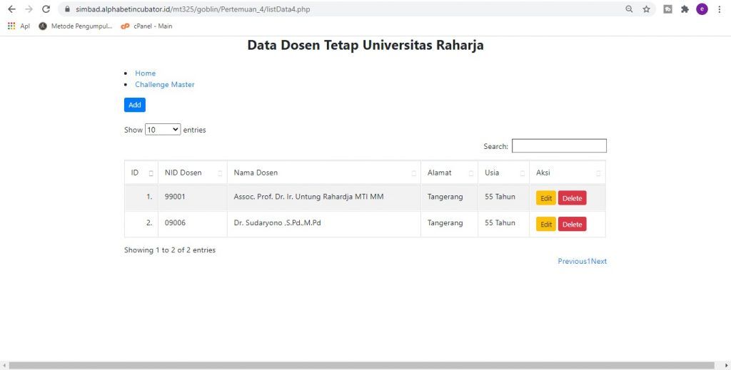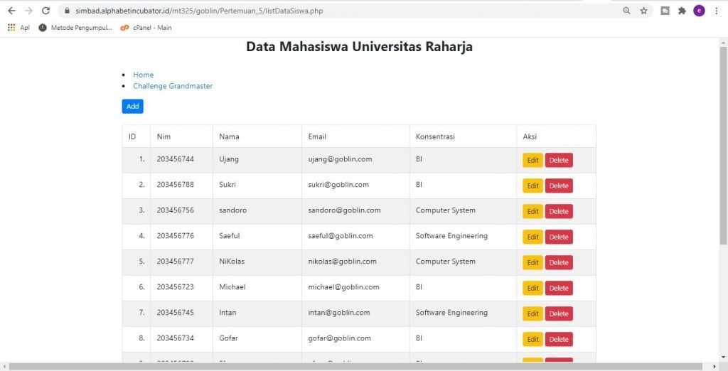 1. Table Mahasiswa (ID, Nama, No.HP, Email, Aksi)