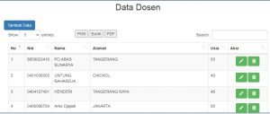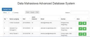 Kelompok kami sudah membuat tabel mahasiswa beserta isinya. Di dalam tabel ini sudah tersedia menu tambah data untuk menambahkan data baru. Selain itu ada menu hapus untuk menghapus data, serta menu edit untuk memperbaiki data yang salah. Data mahasiswa bisa di konversikan ke exel ataupun ke PDF. Selain ada menu print untuk mencetak data mahasiswa. KEREEEENNNN kan kelompok kami hehe…oh ya masih ada satu lagi nih ada menu search untuk mencari data mahasiswa yang di inginkan…misalnya jika kita ingin mencari nama Tri maka tabel mahasiswa otomatis menampilkan nama yang ada inisial Tri nya.