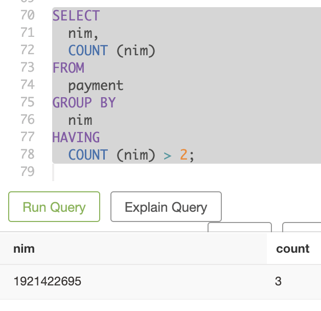 Menampilkan jumlah nim yang ada pada tabel payment dengan membuat group berdasarkan nim dan di filter dengan jumlah yg lebih besar dari 2