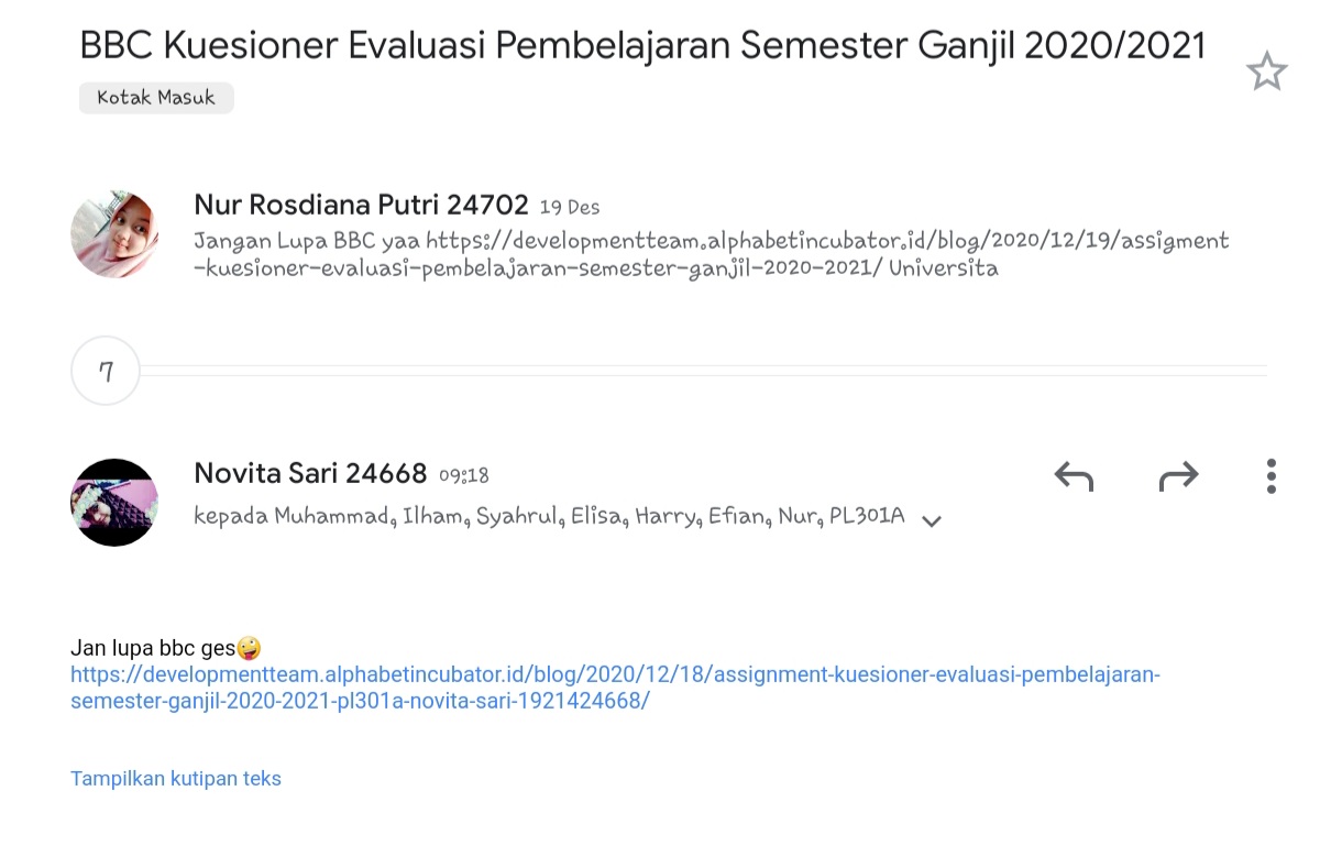 Assignment Kuesioner Evaluasi Pembelajaran Semester Ganjil 2020/2021 PL301A Novita Sari – 1921424668