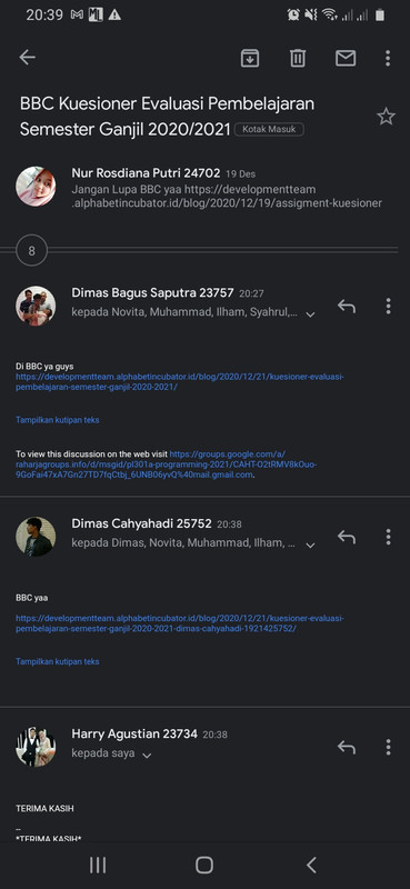 3. Langkah terakhir yaitu semua jawaban ke dalam https://developmentteam.alphabetincubator.id/ dengan cara Add New Post di dalam https://developmentteam.alphabetincubator.id/ yang kemudian juga dikirim ke milis & WAG  [email protected] untuk lakukan diskusi dan dikomentari oleh minimal 10 BBC baik di milis maupun pada link jawaban.