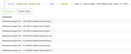 Tugas kalian pada pertemuan kali ini adalah membuat sebuah rangkaian kata /concatenation dari kolom nim_mhs dan dan nama_mhs pada tabel mahasiswa dengan menggunakan query, Sehingga menghasilkan seperti gambar dibawah ini
