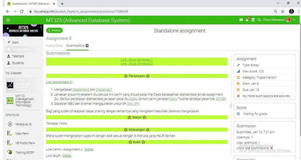 2. Jawaban disubmit kedalam iDu berupa link cermi yang dibuat pada iMe Class berdasarkan standarisasi jawab assignment iDu.