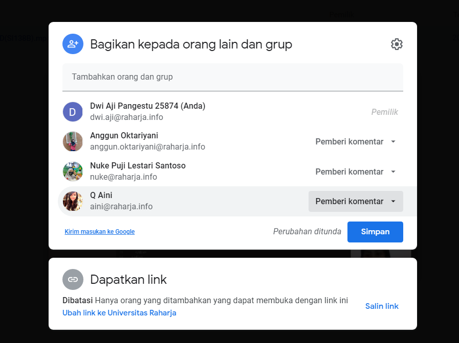 Sudah upload kedalam Rinfo Drive masing-masing kemudian berikan akses ke [email protected], [email protected], [email protected].